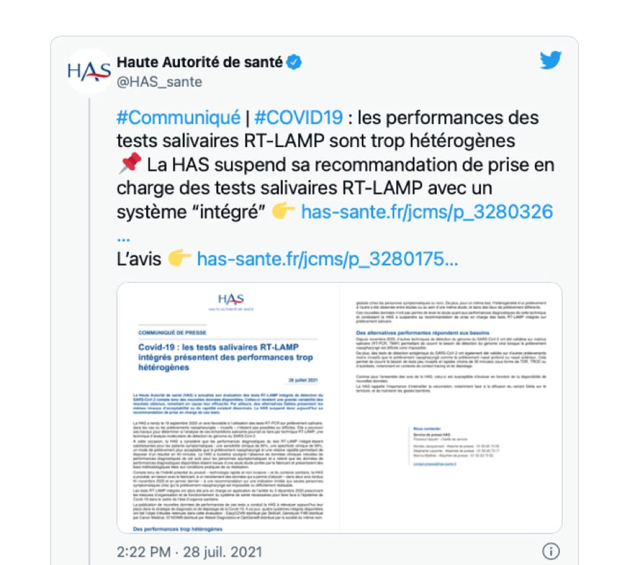 En France, en janvier 2021, la Haute autorité de santé (HAS) s’est prononcée sur EasyCOV, un autre type de test salivaire, qui utilise la RT-LAMP au lieu de la RT-PCR. Ce type de test fonctionne avec une analyse moléculaire rapide, sans passage en laboratoire, contrairement au RT-PCR. Créé par le laboratoire Sysdiag, et commercialisé par Skillcell, ce test qui permet d’obtenir un résultat en 40 minutes, présentait des incertitudes concernant sa sensibilité, avait estimé la HAS en novembre 2021. Du coup, en cas de test EasyCOV positif, il fallait faire un test PCR pour confirmer cette positivité. « En l’attente de données complémentaires prochaines sur ses performances chez les personnes asymptomatiques, l’indication recommandée du test EasyCov est inchangée : utilisation chez les patients symptomatiques, pour lesquels le prélèvement nasopharyngé est difficile, voire impossible », avait alors conseillé la HAS. Puis, dans un avis rendu en juillet 2021, la HAS a publié de nouvelles données de performances, obtenues à partir de quatre tests : Genelyzer FII distribué par Canon Medical, ID NOW distribué par Abbott Diagnostics, EasyCov distribué par Skillcell, et OptiGene distribué par l’entreprise du même nom. Ces tests ont obtenu des résultats « de 97 % à 99 % » lorsqu’il s’agit de déterminer qu’une personne saine n’est pas positive. En revanche, la HAS a jugé que « les données de sensibilité [la capacité à déterminer qu’une personne contaminée est positive — NDLR] sont problématiques, puisque ces tests [RT-LAMP — NDLR] présentent des résultats très hétérogènes, variant de 30 % à 90 %, sans véritable explication ». Du coup, la HAS a décidé de suspendre sa recommandation de prise en charge, concernant ces tests RT-LAMP sur prélèvement salivaire. Seuls les tests salivaires RT-PCR réalisés en laboratoire, contrairement aux tests RT-LAMP, peuvent donc encore être remboursés en France. La même logique a été retenue à Monaco. La HAS recommande de réserver l’utilisation de ces tests « aux personnes pour lesquelles l’acceptabilité du test nasopharyngé est aujourd’hui la plus faible (enfants, personnes âgées, personnes présentant des troubles psychiatriques), ou chez qui le test sur prélèvement nasopharyngé est contre-indiqué ». Les autotests vendus en pharmacie, et qui ne sont pas remboursés, mais aussi les tests antigéniques avec un prélèvement nasal moins profond que le test nasopharyngé, peuvent remplacer les RT-LAMP, sans être plus invasifs, a conclu la HAS.
