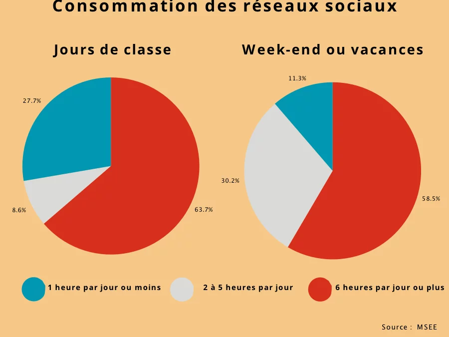 Autre point important de cette étude de l’Espad : l’analyse du temps des jeunes passé sur les écrans. De ce côté-là, les chiffres sont inquiétants, puisque 63,7 % des jeunes disent passer deux à cinq heures par jour sur les réseaux sociaux en semaine. Cela représente près de 10 % de plus qu’en 2019. Et 8,6 % d’entre eux passent plus de six heures par jour en semaine sur leur téléphone. Le week-end, ils sont 30,2 % à avouer y passer six heures, ou plus, par jour. Et 58,4 % sont devant un écran entre deux et cinq heures, soit 4,2 % de plus qu’en 2019. « On voit pourtant que près des deux tiers des élèves interrogés pensent passer trop de temps sur Internet », explique Julie Marty, chargée d’études statistiques à l’Imsee. Cette réalité est bien connue du gouvernement qui, via Christophe Robino, a fait part de son inquiétude : « Lorsque l’on cumule le temps passé sur les écrans au sein des établissements scolaires et le soir quand les élèves rentrent chez eux, on arrive à des taux horaires cumulés qui sont horribles et extrêmement préoccupants. »
