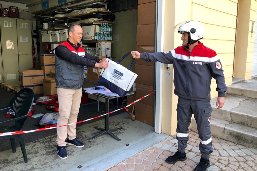 Outre les initiatives individuelles, importantes pour limiter les déplacements et venir en aide aux plus fragiles, il existe en deuxième rempart, la Croix-Rouge. Et son action est multiple, à commencer par une mission d’information avec la mise en place d’une ligne téléphonique spécifique au Covid-19. « A l’heure actuelle, il y a une entité qui est en action c’est le “call-center” [centre d’appel — N.D.L.R.] depuis un petit moment maintenant. Quand ils appellent les pompiers, soit on leur demande de faire le 1 quand c’est une urgence normale, soit on leur demande de faire le 2 si c’est un problème Covid, et ils arrivent sur le “call center”. Ce fameux “call-center”, il y a des opérateurs Croix-Rouge, et il y a des opérateurs de la Dasa [Direction des affaires sanitaires — N.D.L.R] qui répondent au téléphone, pour répondre à la population. Il y a des appels de tous types. Si des gens sont symptomatiques, un médecin les prend au téléphone », explique Maria-Cécile VanMoen, directrice adjointe en charge de la formation à la Croix-Rouge. Hormis sa mission de conseils et d’informations, la Croix-Rouge, mentionnée par ailleurs dans l’allocution du prince du 17 mars 2020, vient également aider aux services de livraisons alimentaires communaux. « On a plusieurs types d’actions à l’heure actuelle. On aide la mairie sur la distribution des repas à domicile. La mairie a un numéro qui a été mis en ligne pour les repas à domicile, pour se faire livrer le midi et le soir. Ensuite, il y a des bénévoles Croix-Rouge qui vont faire les courses pour les gens sur le marché de la Condamine. C’est aussi un service de la mairie. On livre les personnes confinées chez elles, soit parce qu’elles sont symptomatiques, soit parce qu’elles sont des personnes à risque, des personnes handicapées… Si ces personnes-là n’ont pas de famille, il faut bien que quelqu’un s’occupe d’eux. La mairie, c’est plus tout ce qui est nourriture, en collaboration avec la Croix-Rouge pour les aider à la distribution. »