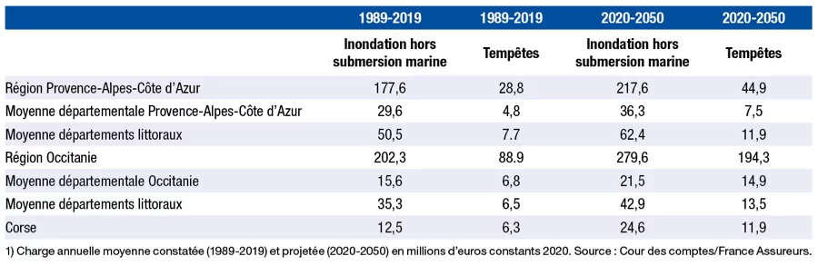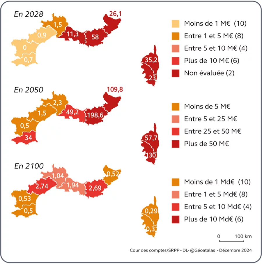 Ce rapport évoque aussi la problématique de la valeur des biens exposés à la montée des eaux. D’ici 2 100, sur le littoral méditerranéen, cette valeur pourrait s’élever à 11,5 milliards d’euros. Face à ce chiffre, la Cour des comptes estime qu’à « brève échéance et à cadre constant, le système assurantiel et indemnitaire ne pourra supporter la couverture de la réalisation et de l’intensification des risques », et que, d’ici trente ans, « le coût cumulé des indemnisations à ce titre s’élèverait à 54 milliards d’euros, selon une projection effectuée par les assureurs portant sur tous les biens indemnisés pour ces dommages sur le territoire national ».