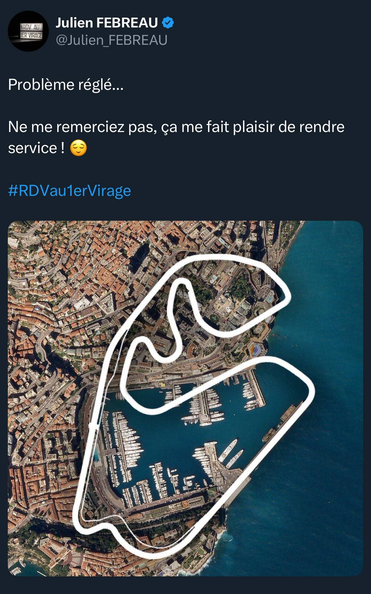 Dans une vidéo publiée sur son compte Instagram, cet Autrichien a pointé trois zones du circuit monégasque où des changements pourraient, selon lui, favoriser les dépassements et le spectacle. Alex Wurz évoque la Nouvelle Chicane, une extension de la sortie du tunnel, et un déplacement de la chicane vers le virage du Tabac. Il parle ensuite de décaler le point de corde du virage de la Rascasse de deux à trois mètres vers l’extérieur, ce qui implique d’élargir la piste. Enfin, le président de la GPDA avance un autre élargissement de deux mètres environ à l’entrée et à la sortie : celui de l’entrée de l’épingle du Fairmont. De son côté, sur le ton de l’humour, le journaliste et commentateur de Canal+, Julien Fébreau, a publié sur X [voir notre photo – NDLR], sa solution : créer un nouveau circuit à Monaco. Spectacle et frissons garantis.