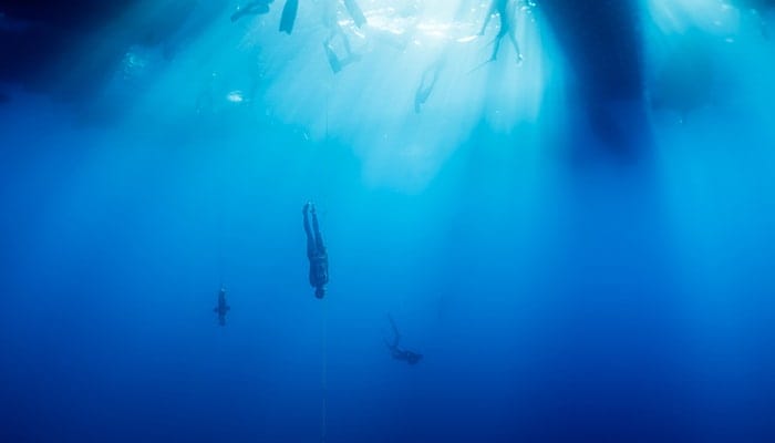 80 personnes sont en mer pour assurer la sécurité autour de ces championnats du monde d’apnée. On les surnomme les “safety drivers”. Celui qui chapeaute ce dispositif n’est autre que le Monégasque Pierre Frolla, multiple champion du monde d’apnée. Avec son bateau Pirates of the Abyss, il a la lourde charge d’assurer le bon fonctionnement et la sécurité des participants. De nombreux médecins font évidemment partis du staff. « Sur 38 plongées lors de l’épreuve de CNF hommes, on ne dénombre pas moins de 17 cartons rouges, dont 7 syncopes. Une journée tendue pour les “anges gardiens” des compétiteurs », explique le webmagazine France Apnée. Si en surface la mer est entre 24 et 25 degrés, elle n’est plus qu’à 14 degrés en profondeur. Une gestion de température qu’il faut aussi anticiper et qui peut paralyser les membres inférieurs. Toutes ces attentions visent à promouvoir une apnée sûre auprès du grand public. Il y a aussi les juges internationaux, chargés d’arbitrer les plongées, invalidées en cas de syncope ou de toute autre événement de santé. A l’arrivée en surface, chaque apnéiste a ainsi l’obligation de procéder à plusieurs actions de sécurité qui garantissent une bonne forme mentale après l’apnée.
