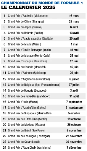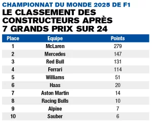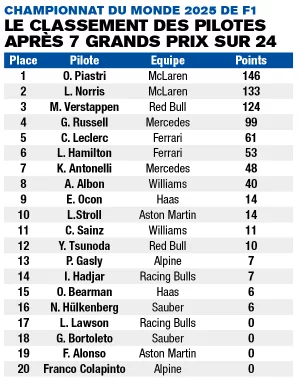 Formule 1, championnat du monde 2025 : les résultats course par course, après 7 Grands Prix sur 24