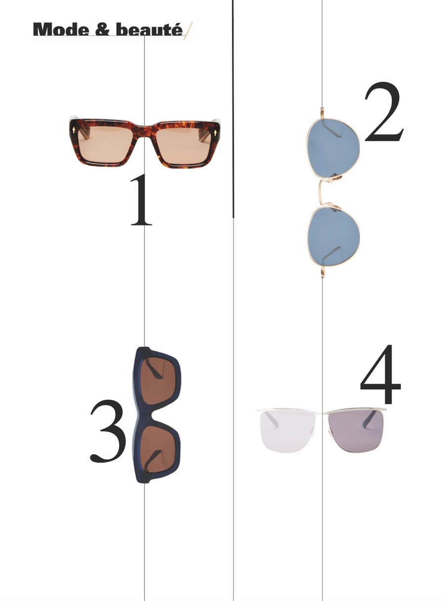 1. Lunettes de soleil, Jacques Marie Mage (627 euros) 2. Lunettes de soleil rondes en titane, Matsuda (648 euros) 3. Lunettes de soleil carrées, Kuboraum (315 euros) 4. Lunettes de soleil, Gucci (350 euros)