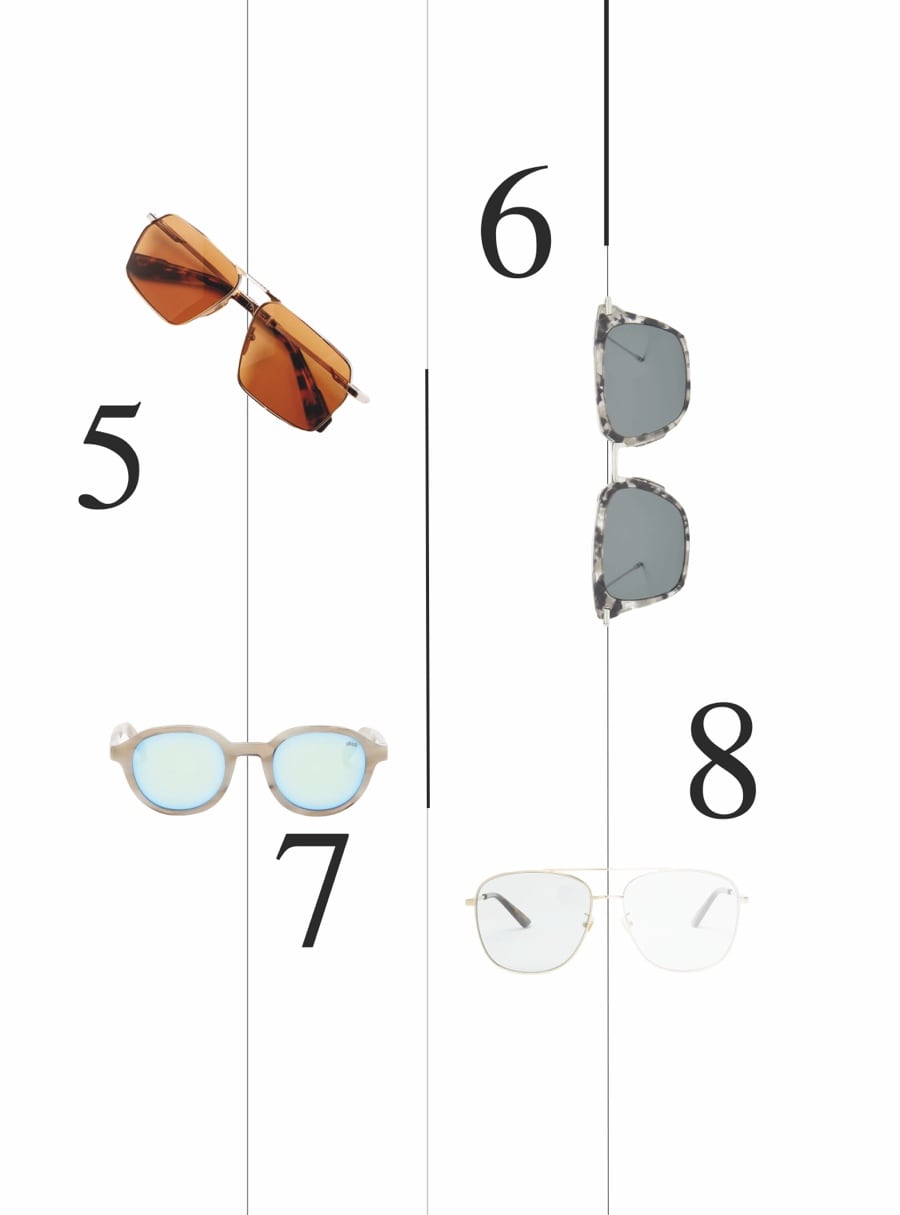 5. Lunettes de soleil carrées en titane, Jacques Marie Mage (676 euros) 6. Lunettes de soleil, Thom Browne (625 euros) 7. Lunettes de soleil rondes, Berluti (367 euros) 8. Lunettes de soleil aviateur, Gucci (300 euros).
