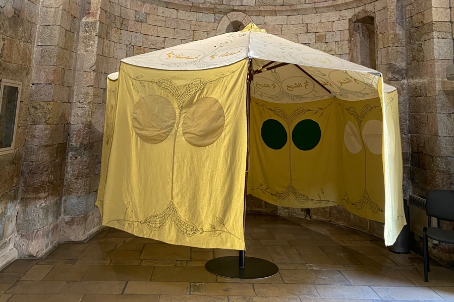 Mounira Al Solh est l’invitée du musée national Pablo Picasso jusqu’au 2 novembre 2020. Elle présente Mon heure préférée est une heure de la nuit : Al Fahmah, une exposition aux multiples supports : photographies, installations, dessins ou encore broderies. Née en 1978 à Beyrouth, cette artiste tente, à travers son art, de sensibiliser le public sur les enjeux de déplacements autour de la Méditerranée. Elle s’est penchée notamment sur la crise des réfugiés syriens. Au cœur de la chapelle du musée, elle a déployé une tente brodée des vingt-quatre noms arabes désignant les heures du jour et de la nuit. L’œuvre s’intitule Mina El Shourouk ila Al Fahmah-Lackadaisical sunset to sunset. Lorsque le promeneur entre dans cette tente, il peut y apercevoir des inscriptions racontant l’émancipation féminine dans le monde arabe.