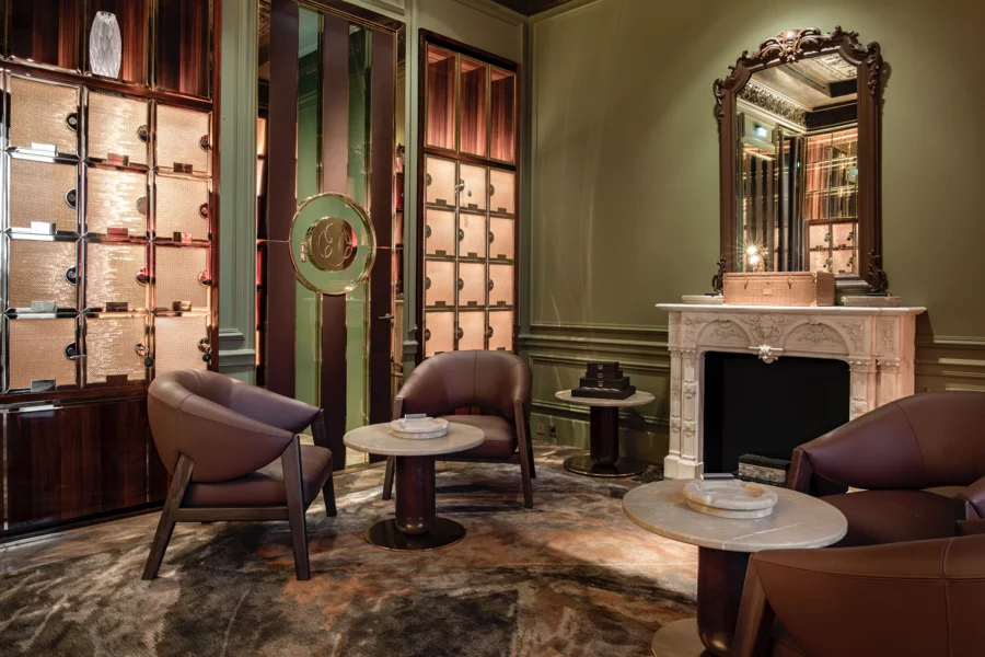 Confiée au cabinet Moinard Bétaille, l’architecture intérieure du club fait le pari du raffinement sans ostentation. Bois précieux, cuir patiné, murs couleur tabac, bar en onyx, étagères de verre : l’ensemble dessine une atmosphère feutrée, à mi-chemin entre les rues de La Havane et l’élégance azuréenne. Un vestibule, un fumoir avec bibliothèque, une terrasse, et surtout un “walk-in humidor” [une cave à cigare — NDLR] conçu par l’entreprise DeArt, une référence mondiale du secteur, composent ce décor, réalisé à l’emplacement même de l’ancien bureau de François Blanc (1806-1877), fondateur de la SBM.