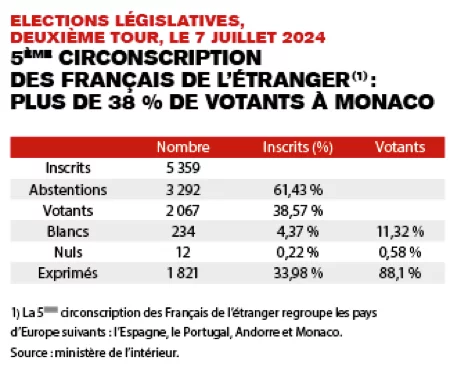 On n’avait pas vu ça depuis 1981. Pour le second tour des élections législatives qui s’est déroulé le 7 juillet 2024, le taux de participation a atteint 66,63 % en France. A Monaco, pour le compte de la cinquième circonscription des Français de l’étranger qui regroupe l’Espagne, le Portugal, Andorre et la principauté, la participation a été beaucoup plus faible, à 38,57 %. Le deuxième tour opposait le député divers droite — Ensemble sortant, Stéphane Vojetta, à Maxime da Silva (La France insoumise (LFI) — Nouveau Front Populaire (NFP)).