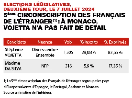 Il n’y a pas eu de suspense, puisque Vojetta a engrangé 61,47 % des suffrages dans cette 5ème circonscription des Français de l’étranger. A Monaco, il a même séduit 82,65 % des votants, qui se sont moins mobilisés que pour le premier tour, avec une baisse de la participation de 6 points. Au total, 2 067 Français installés à Monaco ont voté, sur un total de 5 359 électeurs. Elu sur cette circonscription depuis 2021, Stéphane Vojetta a donc largement convaincu les électeurs, améliorant de 5 points son score de 2022, et laissant seulement des miettes à son challenger, Maxime da Silva. « C’est perdu sur la 5ème circonscription des Français-es de l’étranger. Merci aux électeurs qui ont voté pour nous ! Vojetta, qui flirte avec le RN, est élu grâce à ses voix. Je reste mobilisé, au combat, pour les gens. Avec le NFP qui gagne ce soir ! », a écrit sur X Maxime da Silva, dans la soirée du 7 juillet 2024. « Cher Maxime da Silva, il me semble que vous avez oublié de mentionner le score. 62 % – 38 %. Passez le bonjour à Manuel Bompard de ma part », a ironisé Stéphane Vojetta, toujours sur X. Avant d’ajouter : « Bardella ne gouvernera pas la France. Mélenchon ne gouvernera pas la France. Mais la France n’est pas condamnée à l’immobilisme : une grande coalition est possible. Elle est même nécessaire. J’y travaillerai dès demain, à Paris. »