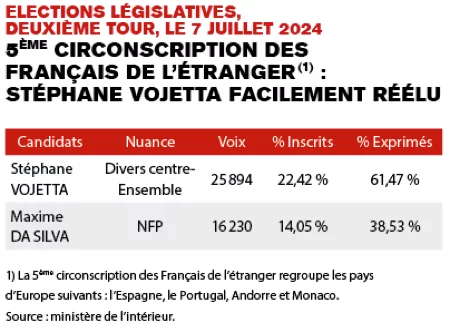 La cinquième circonscription des Français de l’étranger a largement reconduit le député sortant, le divers droite – Ensemble, Stéphane Vojetta, avec près de 62 % des suffrages. Au niveau national français, le Rassemblement national a subi un échec, mais il a gagné des députés. Contre toute attente, si la gauche est devenue la première force à l’Assemblée nationale, elle doit désormais trouver des alliés pour espérer pouvoir gouverner la France.