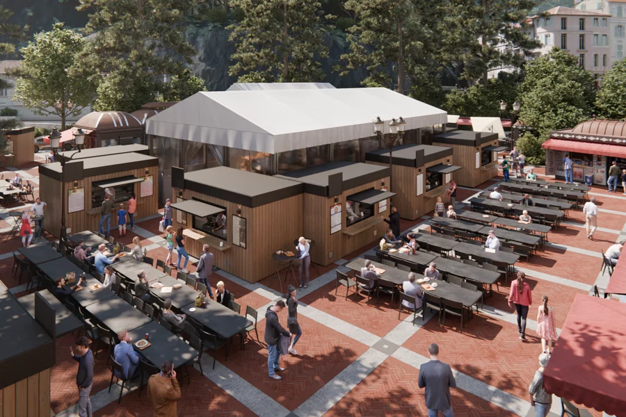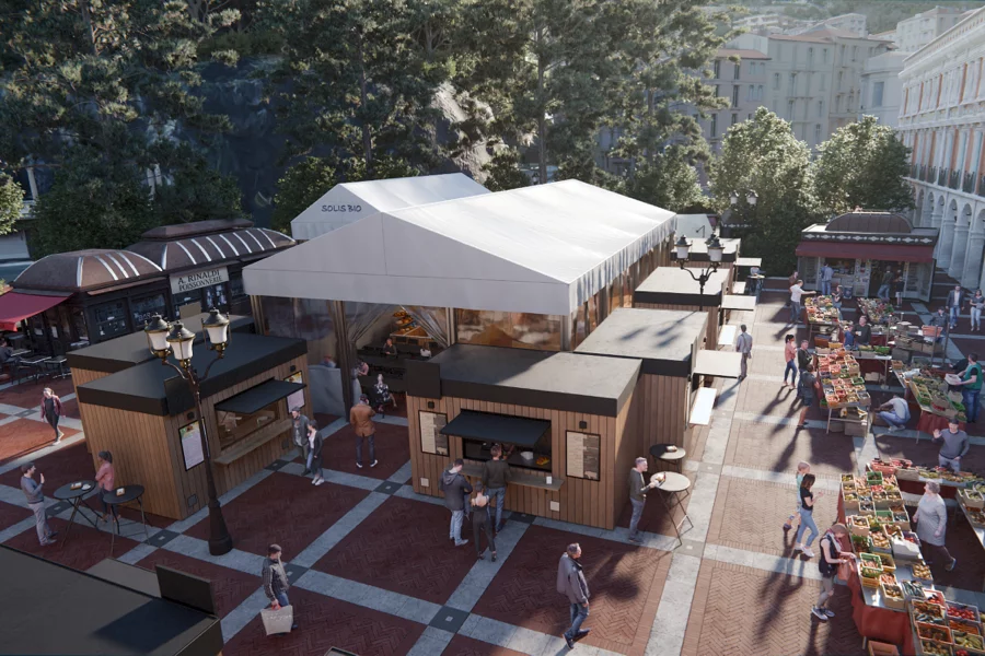Dix kiosques en bois de 12 m2 accueilleront les dix restaurateurs du marché de la Condamine, qui bénéficieront « de lieux équipés en fonction de leur activité », a assuré Marjorie Crovetto, seconde adjointe