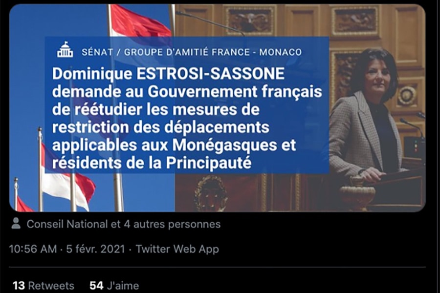« Inapproprié, car il faut raisonner en bassin de vie, en communauté de destin, ajoute Stéphane Valeri. Comment expliquer à un résident de la principauté qu’il ne peut rendre visite à sa famille ou à ses amis installés au-delà d’un rayon de 30 kilomètres, qu’il ne peut se rendre dans sa résidence secondaire lorsqu’il a la chance d’en disposer ? Injuste, car Monaco n’applique pas, à juste titre, cette mesure dans l’autre sens à nos amis français. Injuste aussi, car le résident d’une commune limitrophe à la principauté pourra lui, par exemple, se rendre à Cannes sans être contrôlé, alors que le résident monégasque devra, lui, se munir d’un test PCR de moins de 72 heures. » Pour se faire entendre, la principauté a activé plusieurs canaux. Le 3 février 2021, une série d’échanges se sont déroulés entre le gouvernement monégasque et les cabinets des ministères français. Le président du Conseil national, Stéphane Valeri, a contacté les présidents des groupes d’amitié France-Monaco, à savoir le député Les Républicains (LR) Olivier Dassault pour l’Assemblée nationale, et la sénatrice LR Dominique Estrosi-Sassone, pour le Sénat, afin qu’ils puissent intercéder en faveur de la principauté dans ce dossier. Le 5 février 2021, Dominique Estrosi-Sassone a confirmé sur Twitter qu’en sa « qualité de présidente du groupe d’amitié entre la France et Monaco », elle a écrit au « premier ministre, afin de lui demander de réexaminer la décision unilatérale de la France relative aux nouvelles règles applicables sur le territoire français pour les voyageurs étrangers ». Pour étayer sa demande, cette sénatrice a expliqué qu’elle s’appuyait sur la convention de 1963 entre la France et Monaco qui stipule qu’en France « le régime d’entrée et de circulation d’étrangers titulaires d’un titre de séjour monégasque est identique à celui qui s’applique aux étrangers titulaires d’un titre de séjour français ». Estimant que la réciprocité a été oubliée par la France, car Monaco « n’interdit pas l’accès aux Français à son territoire », Dominique Estrosi-Sassone a invoqué le « nécessaire respect de la hiérarchie des normes et des relations fraternelles et des liens économiques et sociaux très forts entre nos deux pays », tout en espérant que « le bon sens l’emportera ». En attendant, beaucoup de Monégasques et de résidents de la principauté qui affectionnent particulièrement les sorties dans les stations de ski comme Isola 2 000, Auron ou Valberg notamment, s’en retrouvent privés. Tout comme ceux qui possèdent une résidence secondaire dans les Alpes-Maritimes ou dans le Var. « N’oublions pas qu’il s’agit en l’occurence de simplement respecter un accord bilatéral signé entre nos deux pays, et qui a une valeur juridique supérieure à un décret », a insisté de son côté Stéphane Valeri, dans l’interview qu’il nous a accordée